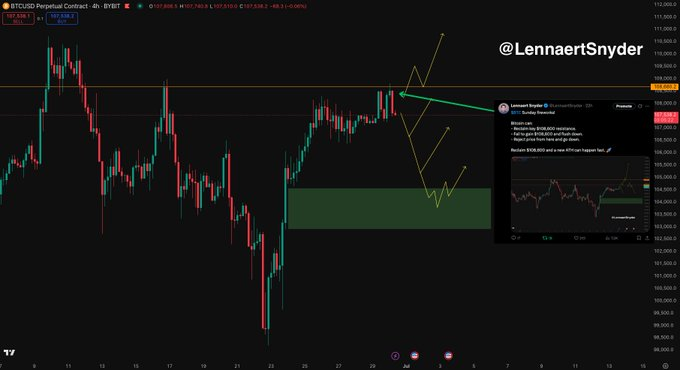 Adding to the outlook, crypto analyst Lenaert Snyder shared his perspective on X on June 30. He noted that Bitcoin’s rejection at $108,600 has stalled its recent rally and could now lead either to a pullback or another attempt at a breakout.