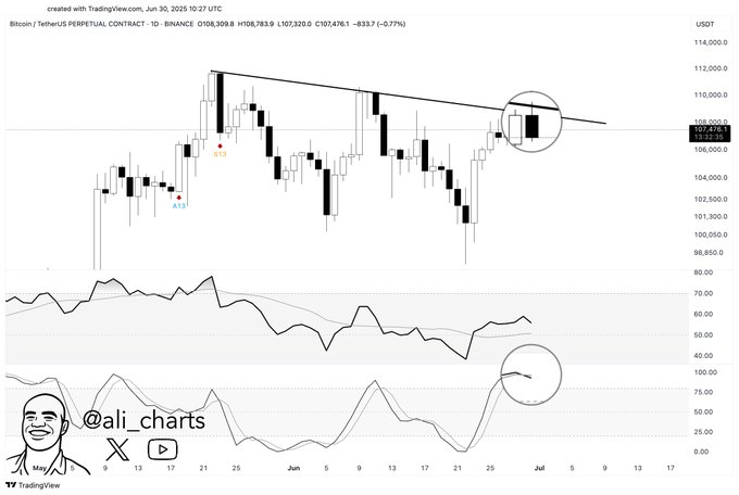 In this case, Bitcoin is facing strong resistance near the descending trendline around $109,000. This level has opened the door for a potential pullback below the psychological $100,000 threshold, according to a June 30 analysis by crypto analyst Ali Martinez.