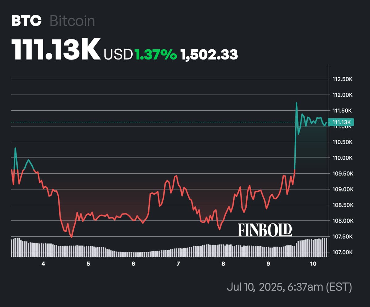 Bitcoin (BTC) surged past $112,000 on Wednesday, July 9, setting a new all-time high amid surging institutional interest and safe-haven demand. At the time of publication, BTC was trading at $111,190, up 1.91% on the day with $62.3 billion in 24-hour volume.