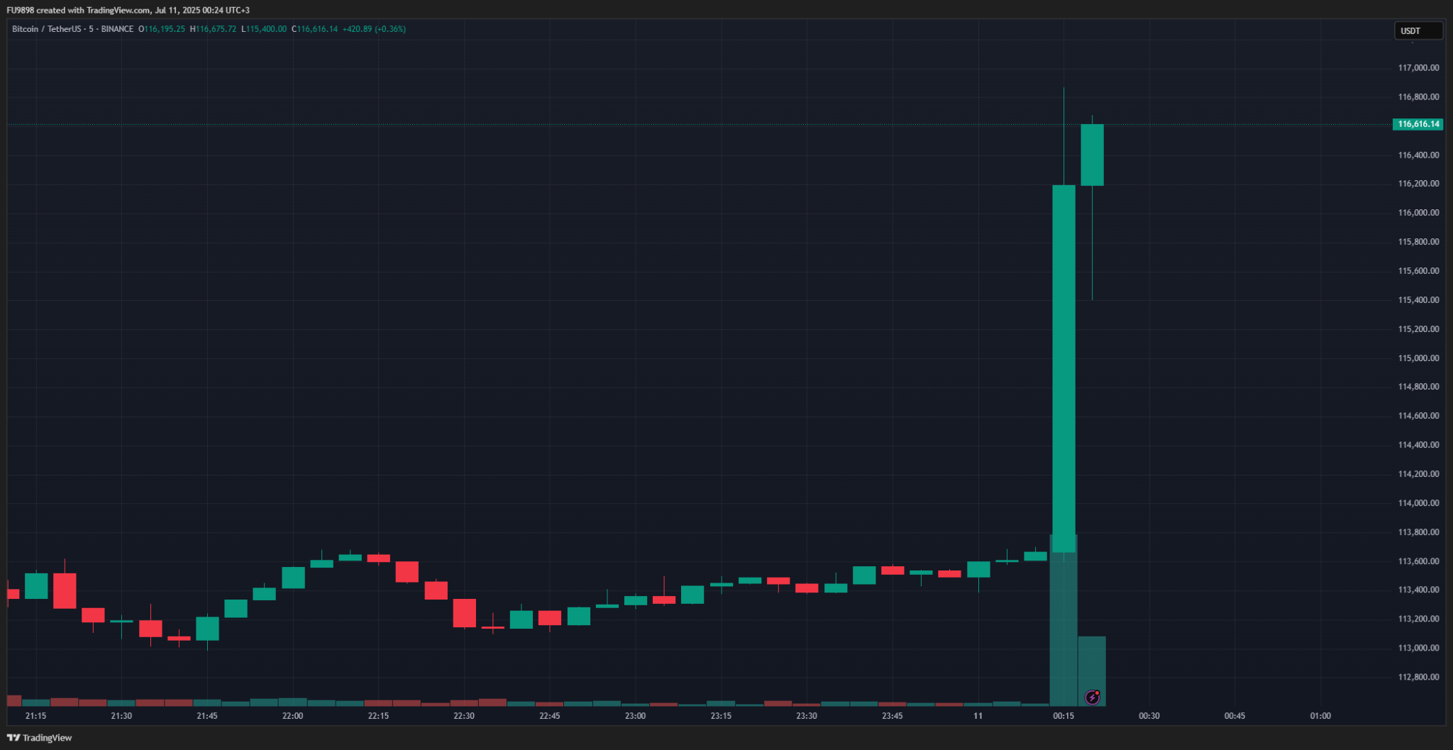 According to breaking news, the Bitcoin price experienced a sudden surge in just two minutes, gaining 2.3% and rising above $116,000.