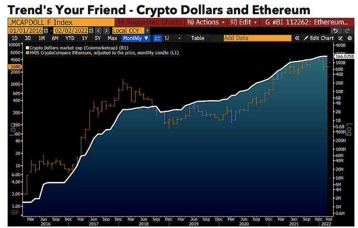 “Ethereum made crypto dollars possible, and the escalating use of the technology to transact greenbacks, support the No. 2 crypto’s price. Approaching $170 billion on Feb. 2, the market cap of the top six crypto dollars listed on Coinmarketcap is up about 5x from the start of 2021. That pace may slow, but we see little to stop what is billions of dollars of market cap from reaching trillions.”