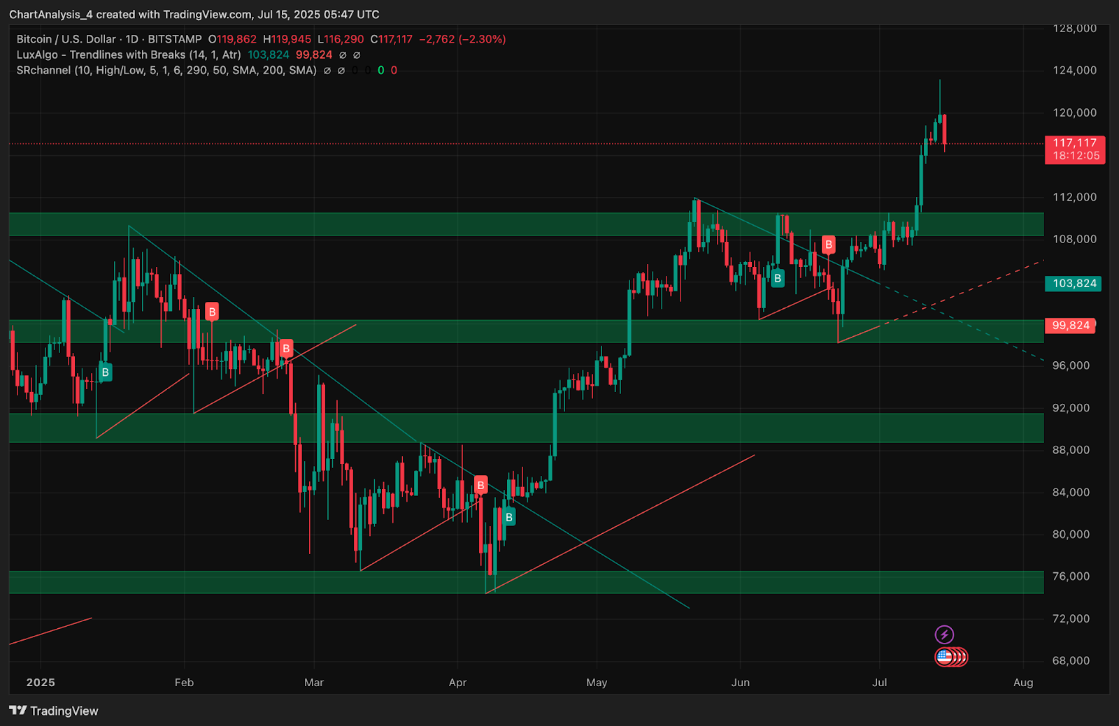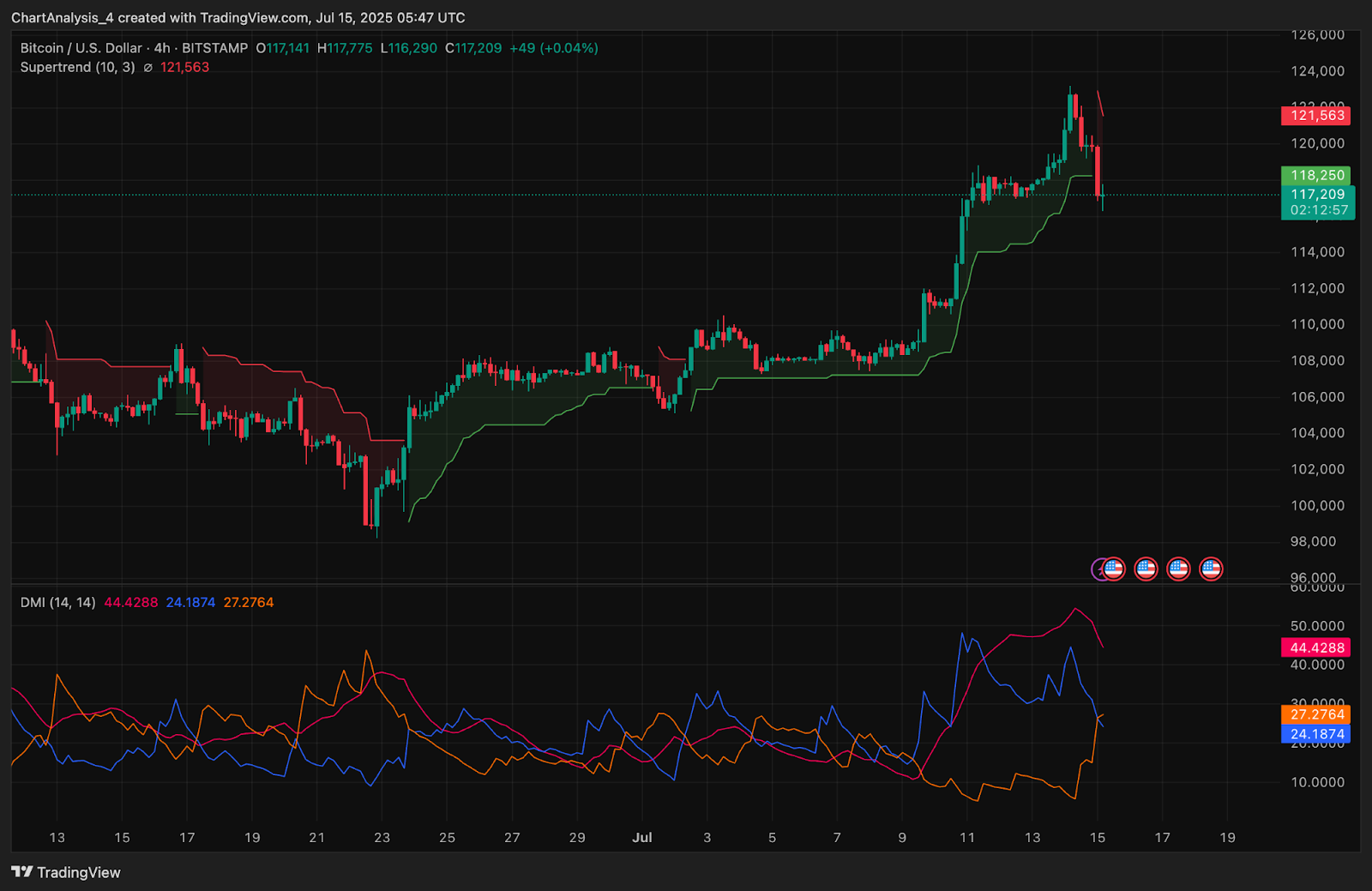 | Supertrend (4H) | Bearish Flip at $121,563 |