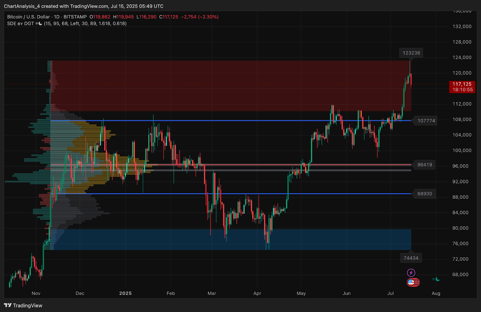 Bitcoin broke out of its range on July 11, rallying over $15,000 to test $123,236 which is a key supply zone marked by a red order block on the daily volume profile. However, price failed to hold above $122,000 and quickly reversed below $118,000 on the 4-hour chart.
