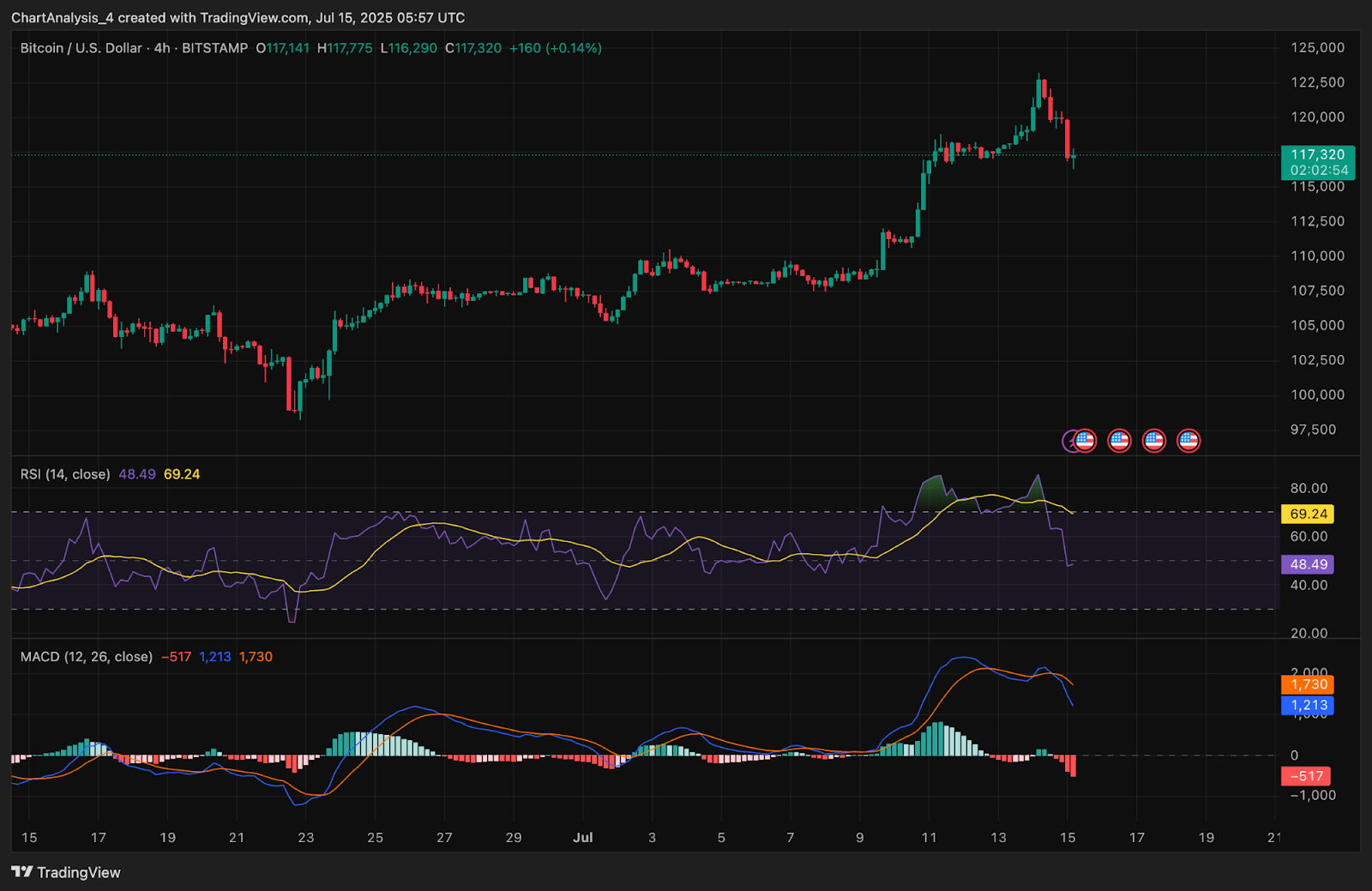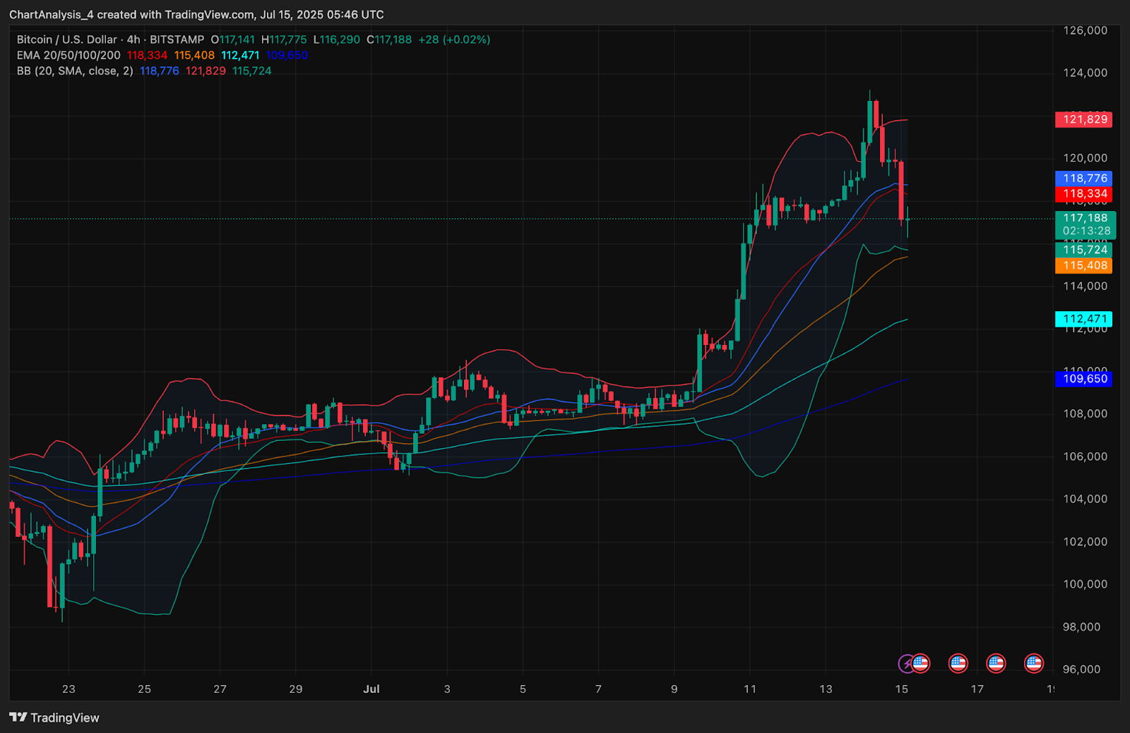 Additionally, the EMAs on the 4-hour chart show early signs of clustering. The 20 EMA is beginning to slope downward at $118,334, while the 50 and 100 EMAs at $115,408 and $112,471 respectively are likely to act as dynamic support if current levels fail.