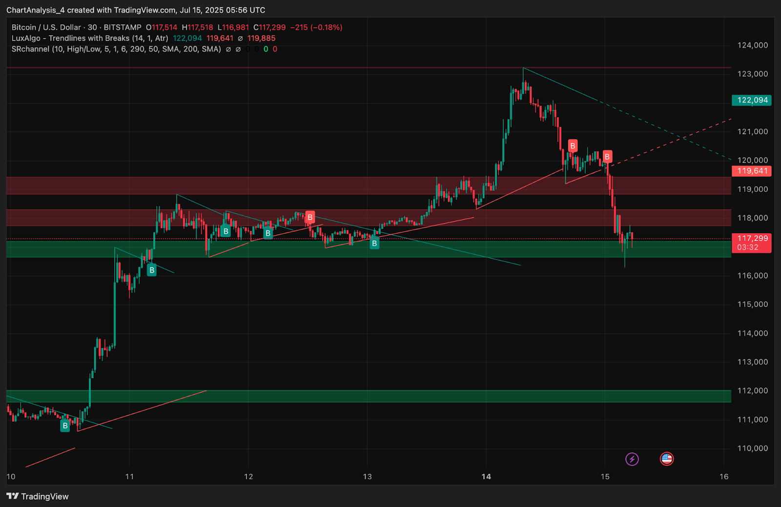 | Bollinger Bands (4H) | Mean at $117,300, Lower Band near $115,700 |