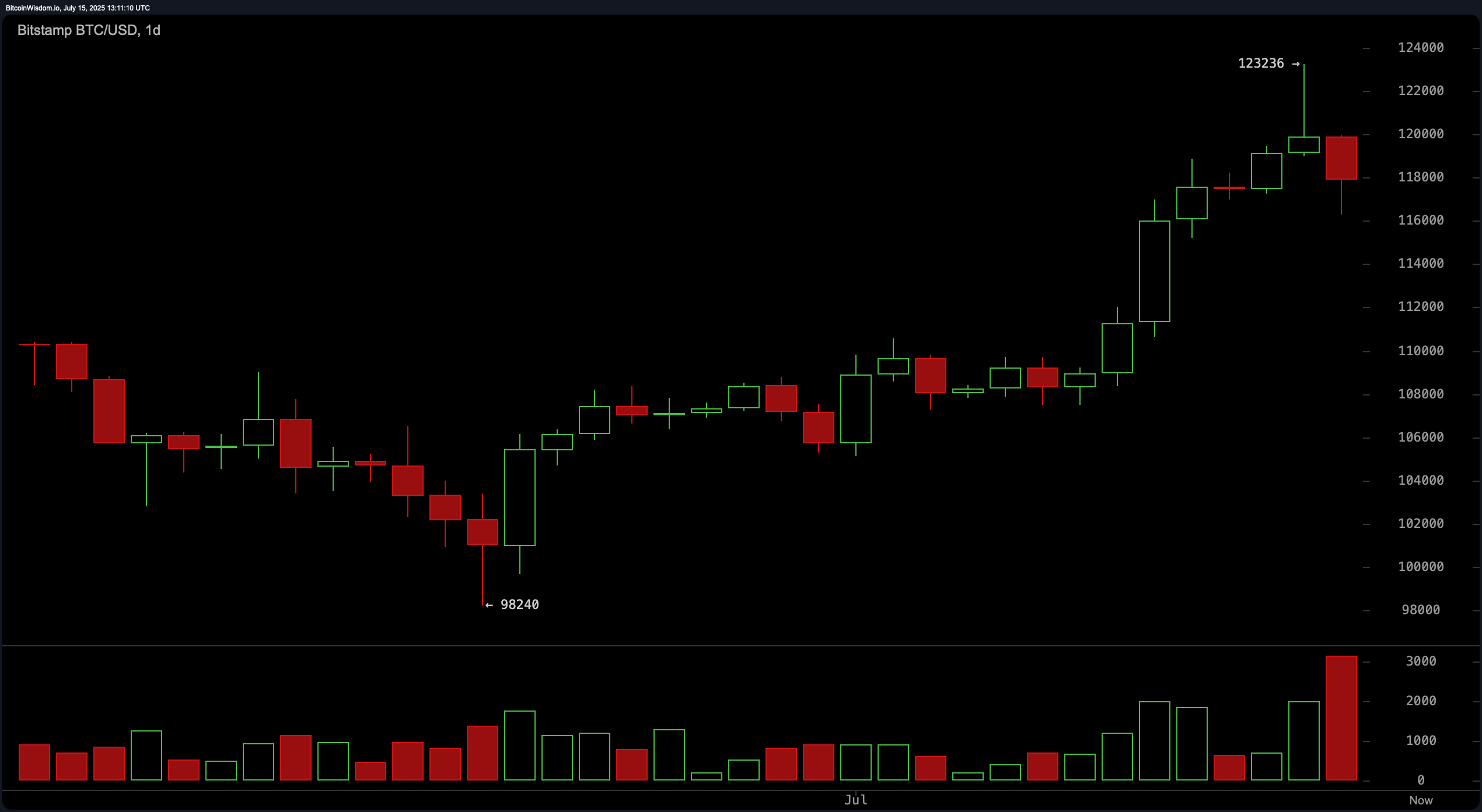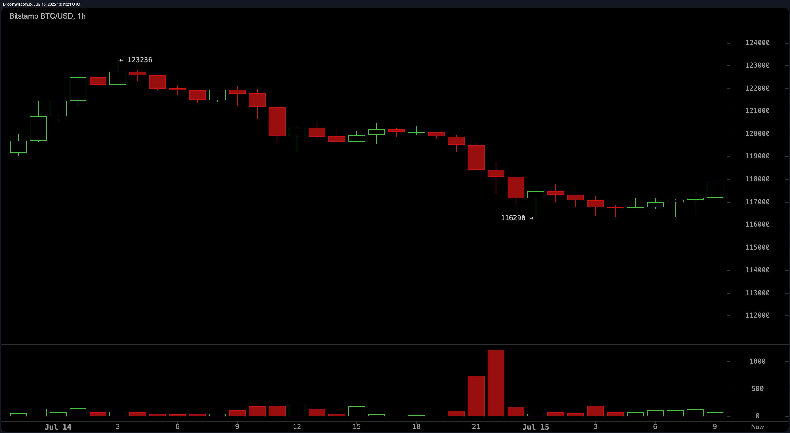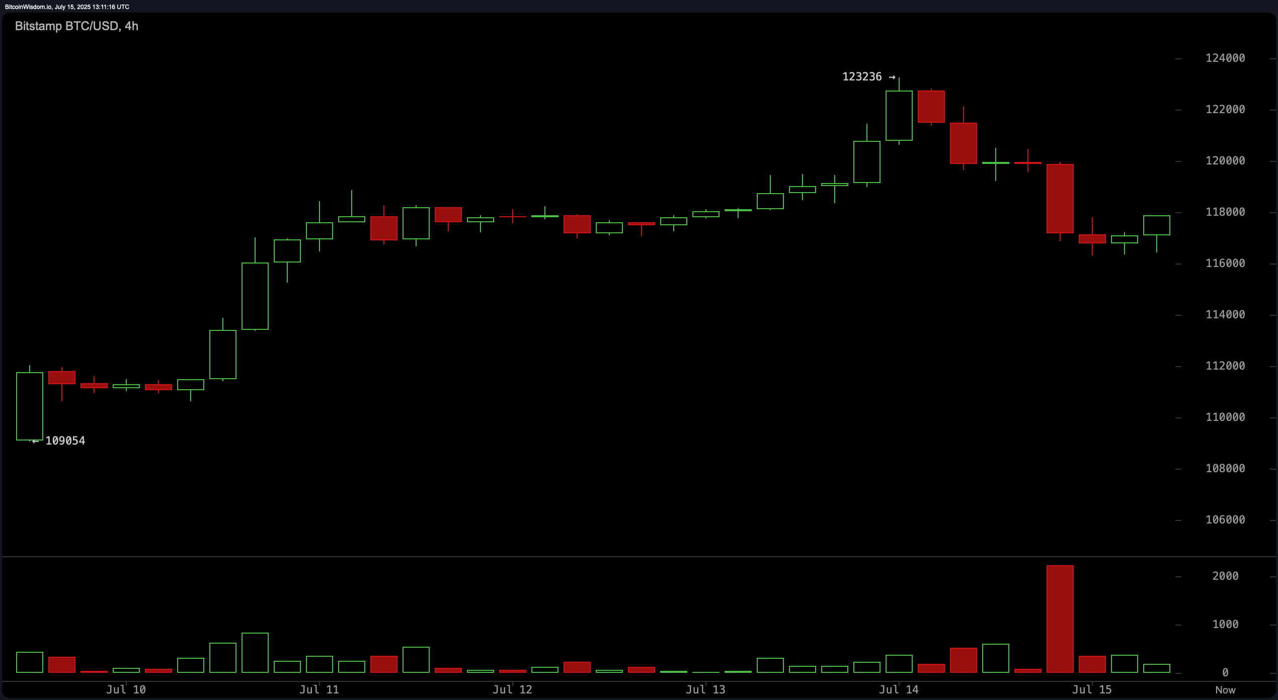 The 4-hour bitcoin chart reveals a textbook blow-off top followed by a structured breakdown and redistribution phase. The move from $123,000 down to sub-$118,000 levels was sharp and marked by strong selling pressure. While a minor rebound has emerged, the lack of volume behind the recovery raises concerns about its sustainability. The $116,000 level remains the immediate support, with the next resistance barrier near $119,500 to $120,000. Any attempt to go long should be conservative and contingent upon a bullish reversal candle confirmed by increased trading activity.