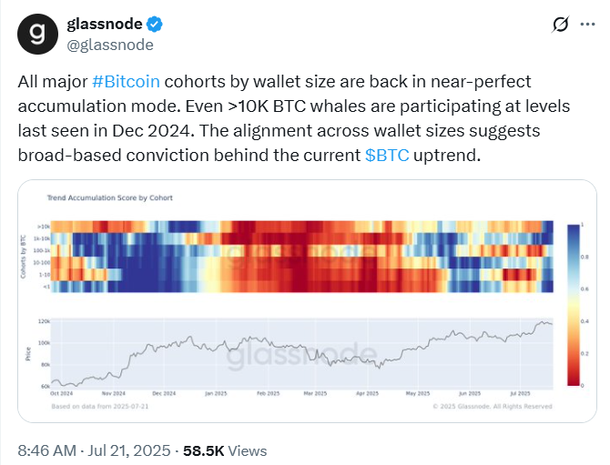 - Even wallets holding over 10,000 BTC are accumulating at levels last seen in December 2024, pointing to strong conviction in the uptrend.