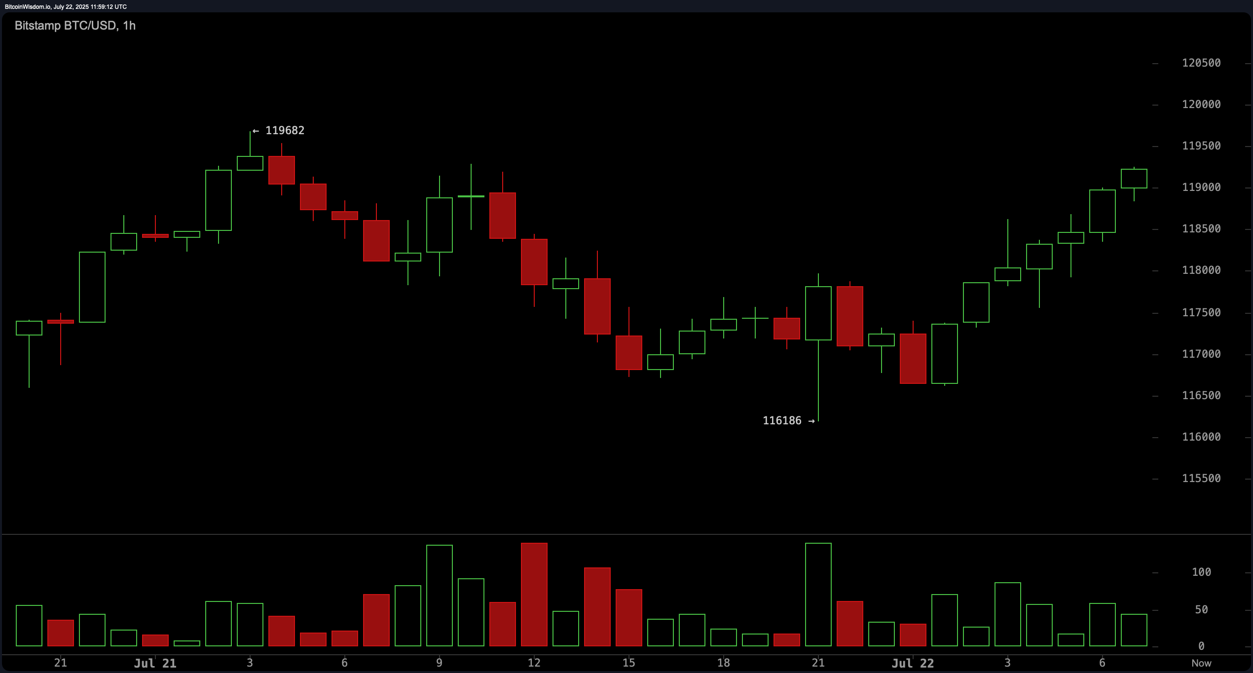 On Tuesday, bitcoin’s price held steady at $119,072 on July 22, 2025, buoyed by a market capitalization of $2.36 trillion and strong 24-hour trading volume of around $56.25 billion. The intraday range reflected volatility between $116,787 and $119,296, offering a dynamic setup for traders across all timeframes.