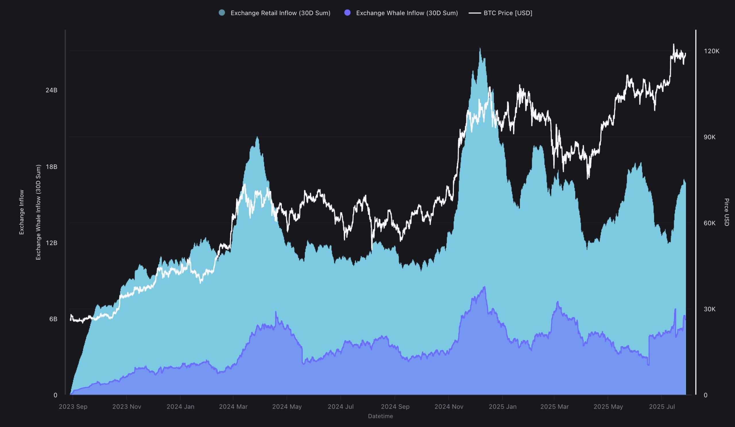 This wave of inflows led to immediate short-term selling pressure, pushing Bitcoin down from the $120K resistance to the $115K–$116K support zone, where it currently consolidates. While retail inflows have been gradually rising, they pale in comparison to this whale activity, highlighting a significant imbalance in market supply.