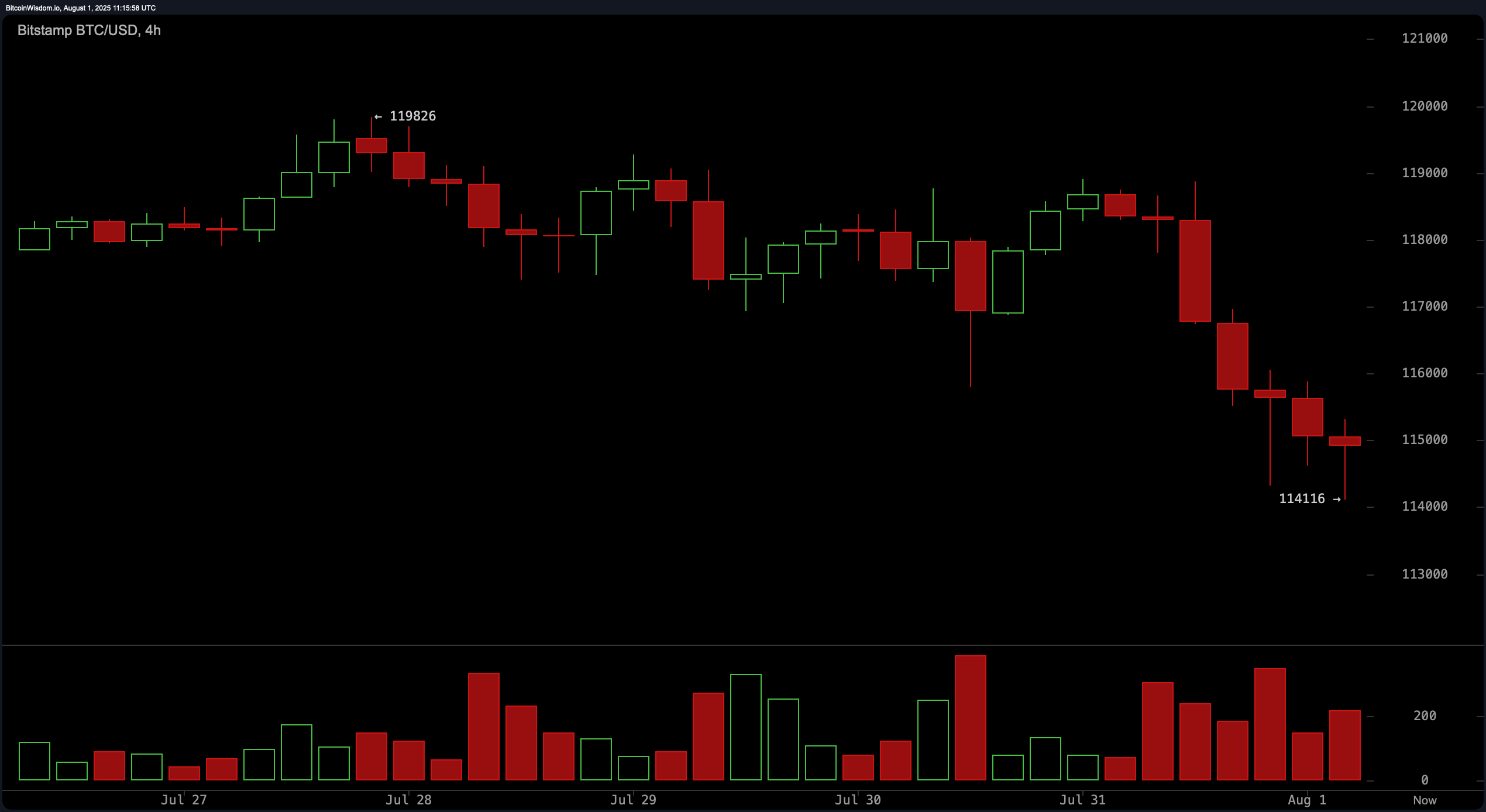 The four-hour bitcoin chart reveals a well-defined bearish market structure characterized by consistent lower highs and lower lows. Notably, red candle volume has increased, reinforcing the prevailing downward momentum. However, support at the $114,116 level is holding for now. A short entry near $117,000–$117,500 appears valid if price faces rejection, while a double bottom formation at $114,000, accompanied by bullish divergence, would provide a compelling case for a long entry.