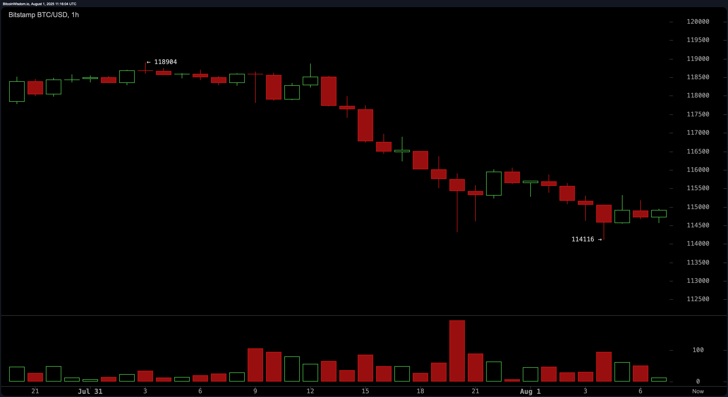 Bitcoin’s price held around $114,656 to $115,078 over the last hour as of August 1, 2025, with a total market capitalization of $2.28 trillion and a 24-hour trading volume reaching $57.10 billion. The intraday price fluctuated within a narrow range of $114,326 to $118,696, signaling consolidation after recent volatility.