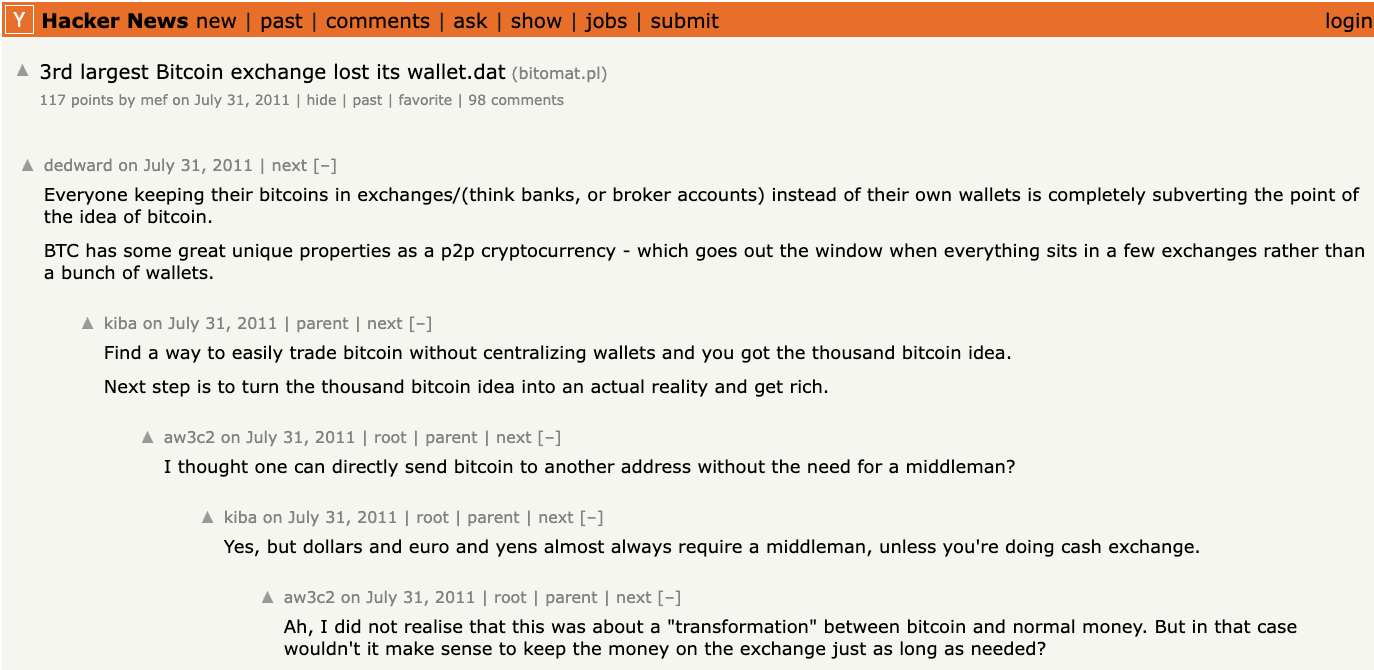 Hacker News users had the right idea in July 2011 — only keep bitcoin in exchanges for as long as you need to.
