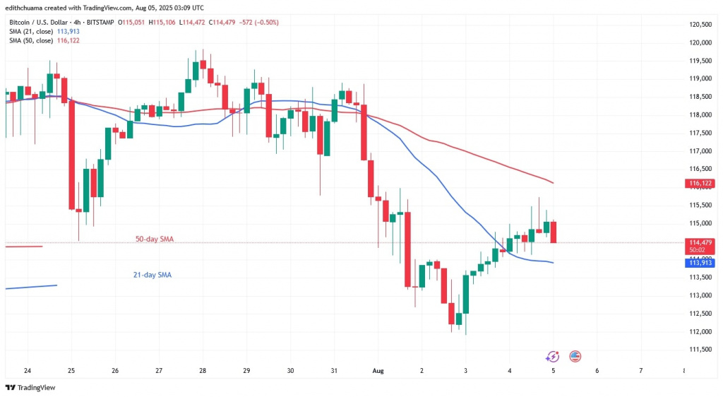 On the 4-hour chart, Bitcoin is falling below the moving average lines. The cryptocurrency is trading above the support level of $112,000 but below the moving average lines or resistance at $116,000. If the current support level of $112,000 is broken, the price of Bitcoin will fall.