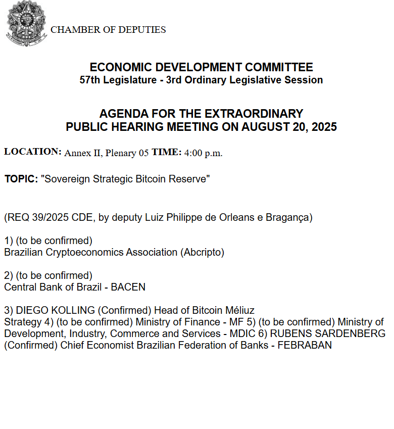 Brazil’s Chamber of Deputies, the lower house of Brazil’s National Congress, has scheduled its first public hearing to discuss the creation of a Strategic Sovereign Bitcoin Reserve for August 20, 2025, according to an official agenda from the Economic Development Committee (CDE).