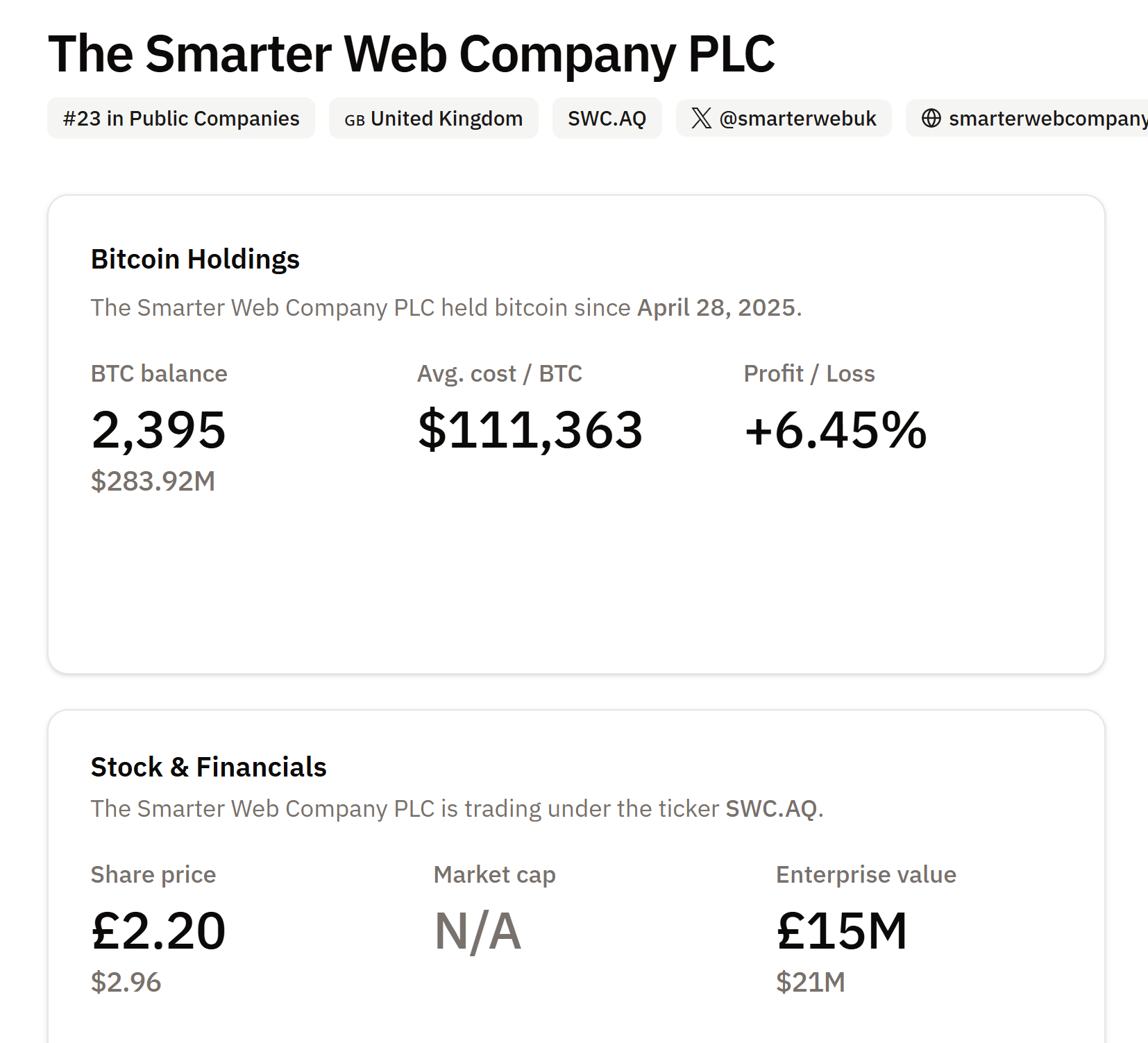 The Smarter Web Company, a London-listed web design and Bitcoin treasury firm, also revealed Tuesday that it has acquired 295 BTC for 26.3 million pounds ($35.2 million) at an average of $119,412.