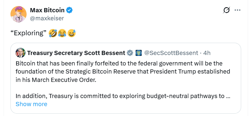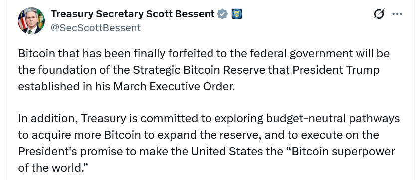 “Treasury is committed to exploring budget-neutral pathways to acquire more Bitcoin to expand the reserve, and to execute on the President’s promise to make the United States the ‘Bitcoin superpower of the world,’” Bessent clarified in an X on Thursday.
