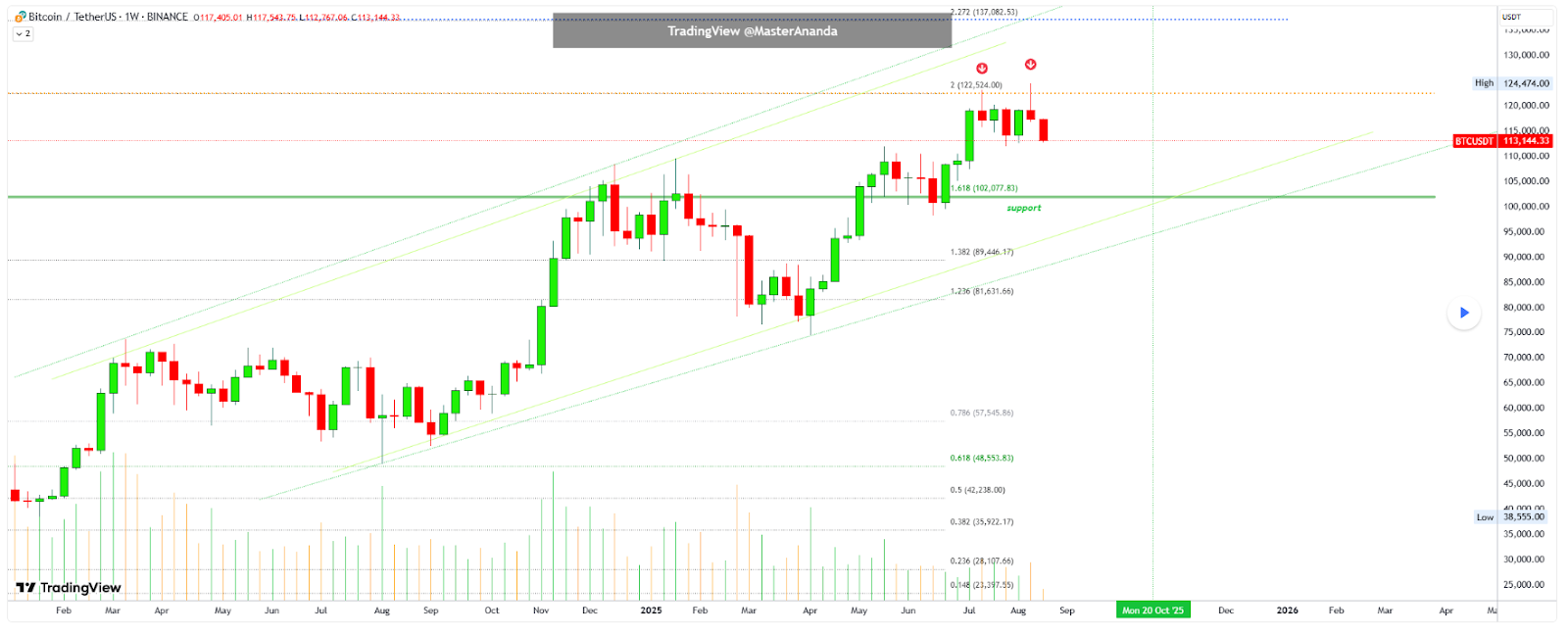 According to analysis by Master Ananda in a TradingView post on August 20, Bitcoin’s inability to move past the $122,524 resistance level has triggered a double-top bearish signal, pointing to the likelihood of a deeper correction in the short term.