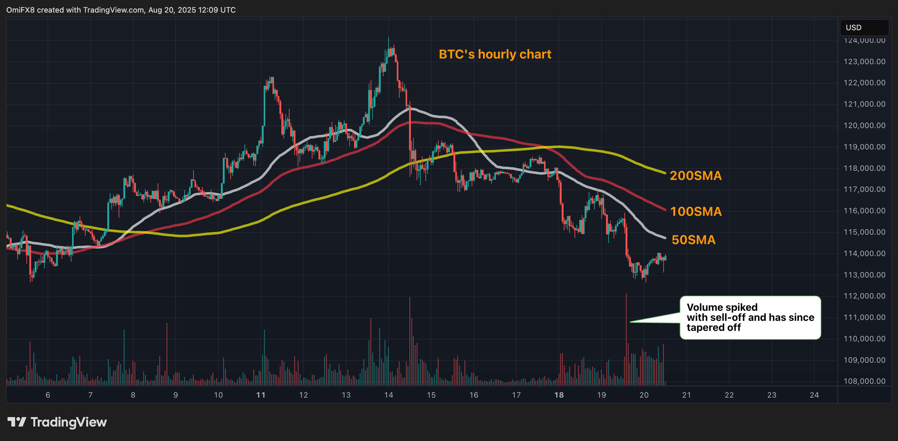 The weak bounce is consistent with bearish momentum signals, as the 50-, 100-, and 200-hour simple moving averages (SMAs) are aligned in descending order and trending downward.