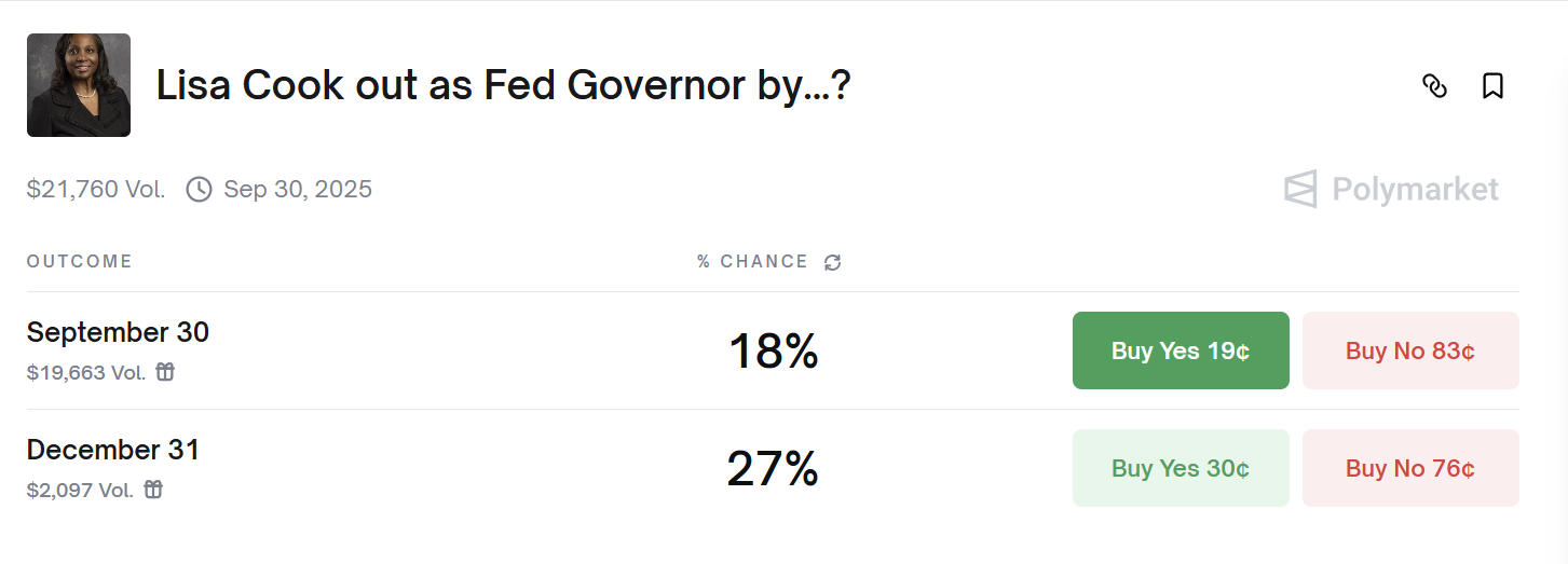 Markets are pricing a 27% chance of Cook's ouster by December 31, indicating some risk of legal or political fallout but still a strong expectation she survives the challenge.