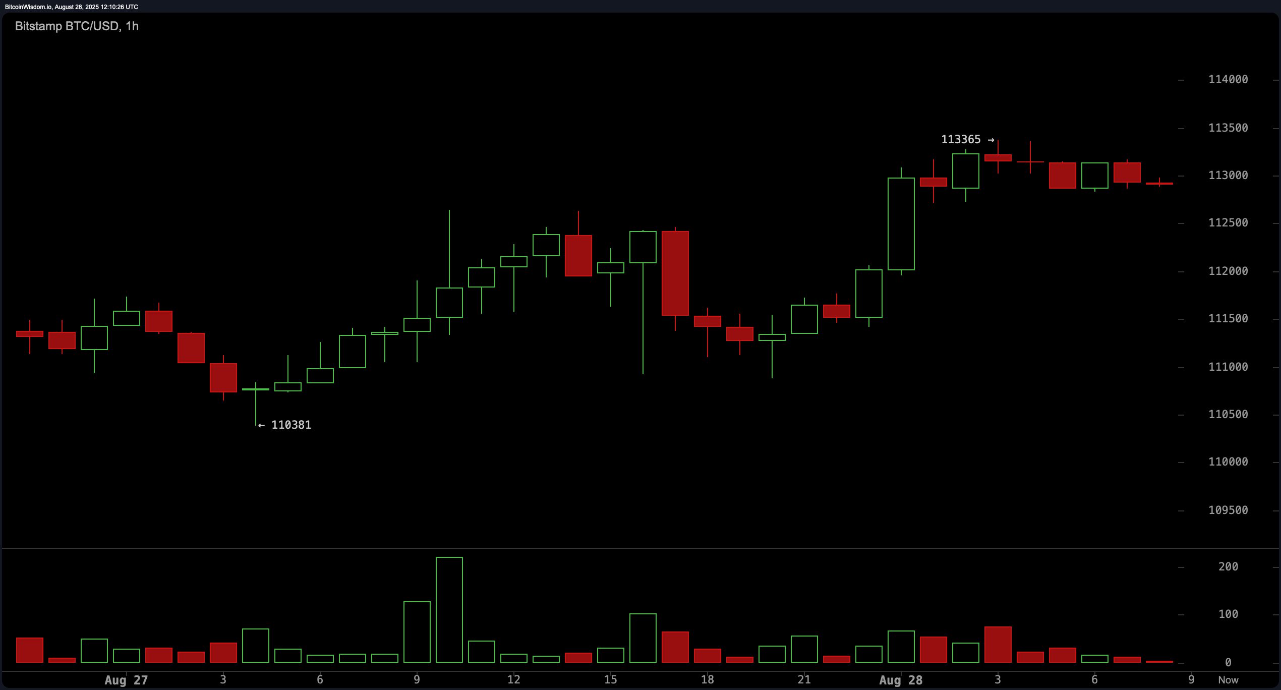 Bitcoin traded at $112,996 to $113,210 over the last hour on Aug. 28, 2025, with a market capitalization of $2.24 trillion. Over the past 24 hours, it saw $37.65 billion in trading volume, fluctuating within a tight intraday range between $110,985 and $113,329.