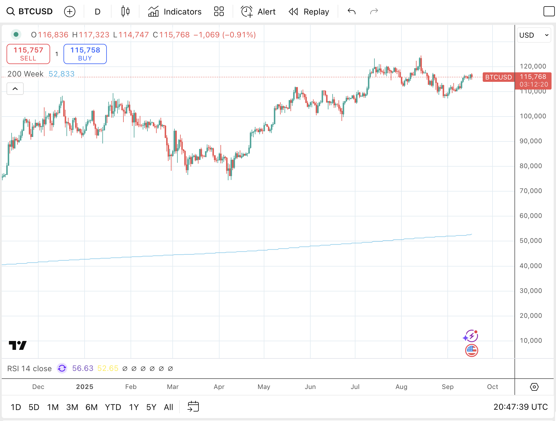 Currently, bitcoin’s 200 Week SMA is sitting at about $52,000. If we see a parabolic rise in bitcoin’s price in the coming months, it could rise as high as $65,000, before bitcoin’s price drops to such a price point or lower some time in 2026.
