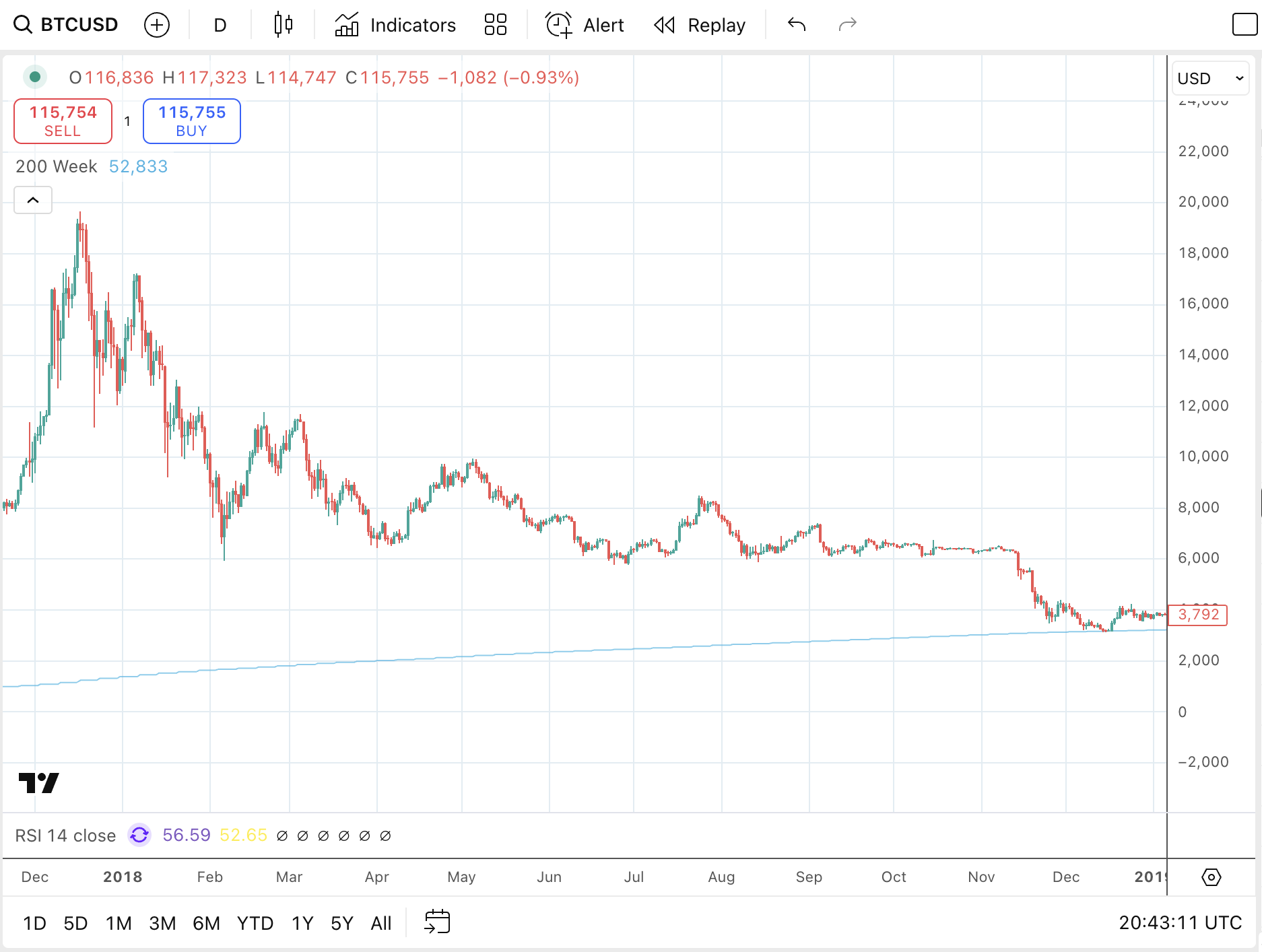 In both cases, bitcoin’s price either tapped or dipped below its 200 Week Standard Moving Average (SMA), the light blue line on the charts below.