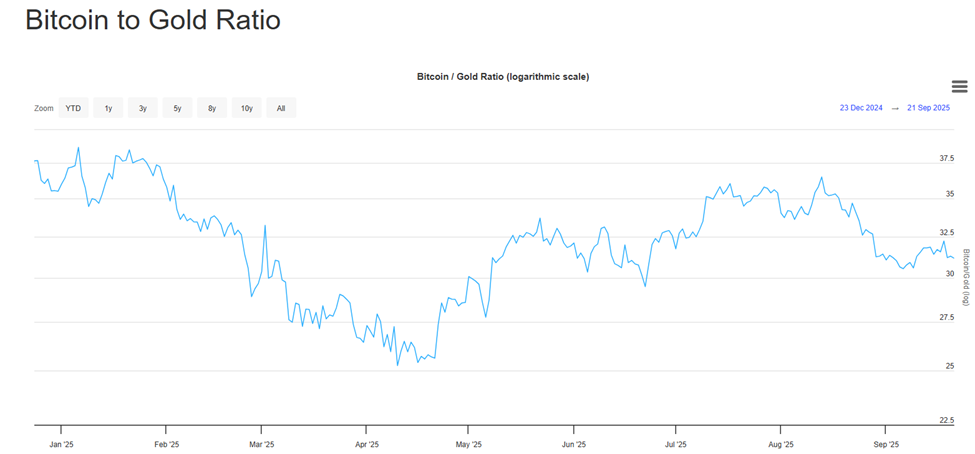 The Bitcoin-to-gold ratio chart shows BTC losing ground in early 2025, rebounding mid-year, then easing lower by September, reflecting shifting relative strength.