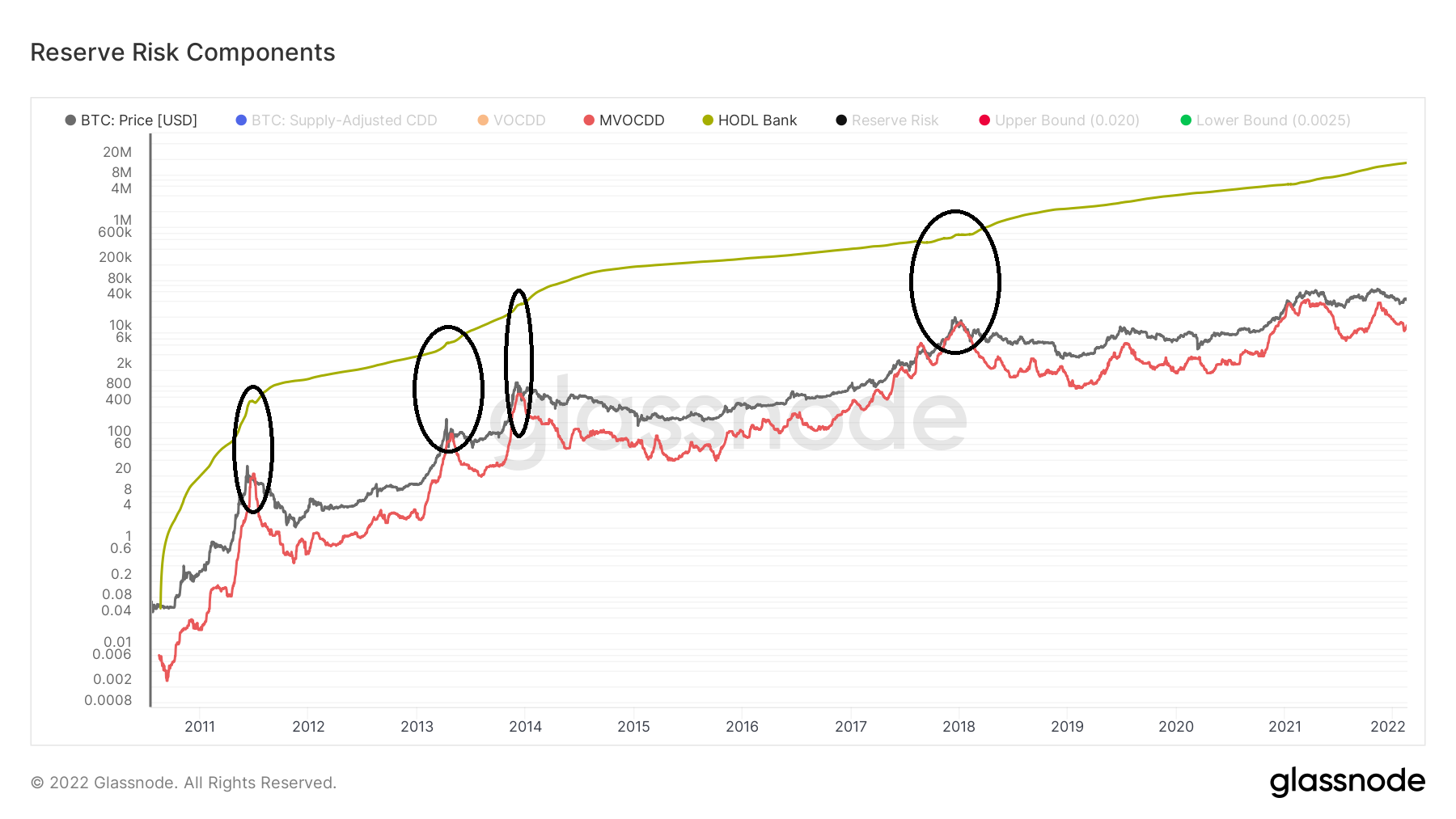 When we put all these components together with the Reserve risk indicator, it’s clearly visible that the indicator reached the overbought levels when MVOCDD moves above the BTC price. Conversely, it reaches the oversold region whenever there is a considerable gap between MVOCDD and the price.