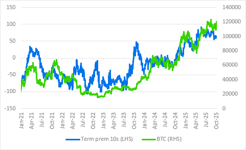In a note published on Friday, Kendrick argued that the U.S. government shutdown is playing a bigger role in markets than in past episodes supporting bitcoin's rally. During the 2018-2019 shutdown, BTC traded in a different context. Now, the largest crypto has been closely correlated with U.S. government risk, measured by the U.S. Treasury term premiums, a relationship that suggests the uncertainty around the shutdown acts as a bullish driver this time.