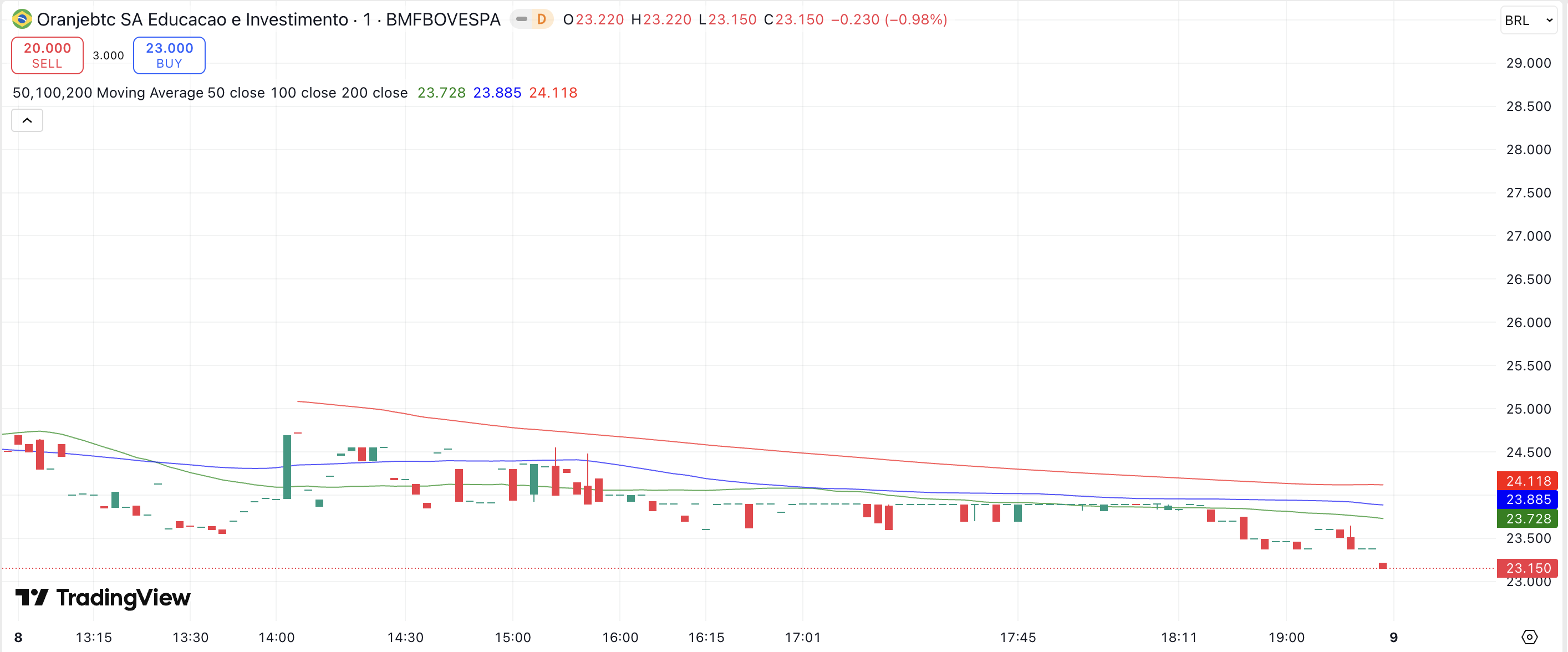 The stock of OranjeBTC opened at $4.35 (23.22 BRL) and saw an early surge, reaching an intraday high of $4.59 (24.50 BRL) as investors reacted to the historic listing. However, momentum faded through the afternoon, and shares closed near their session low at $4.33 (23.15 BRL), reflecting early profit-taking after the initial excitement.