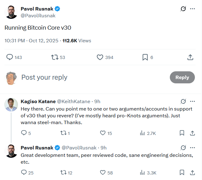 While Satoshi Labs co-founder Pavol Rusnak also stated yesterday that he was opting for Bitcoin Core v30 due to having “great development team, peer-reviewed code,” and “sane engineering decisions.”