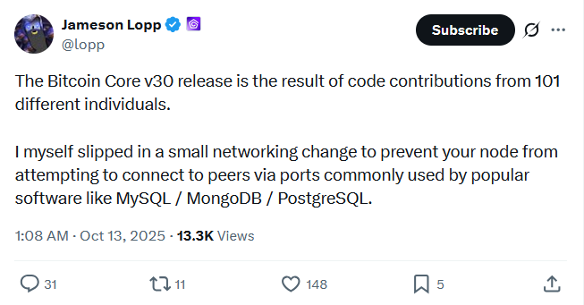 “As a (hopefully) temporary measure, run Knots. I strongly recommend not upgrading to Core v30,” noted pioneer cryptographer Nick Szabo via X last week.