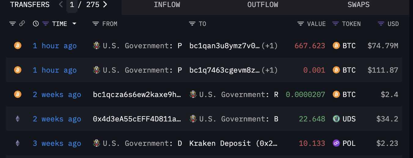 According to Arkham data, the US government wallet recently transferred 667,624 Bitcoin (worth $74.65 million) in two parts to another unknown address, and there has been no further movement since.