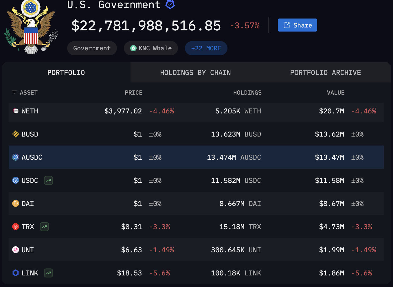 According to Arkham data, the US government still holds 197,354,000 Bitcoins, worth $21.95 billion. Besides Bitcoin, the US government also holds various altcoins such as Ethereum (ETH), WBTC, BNB, Tron (TRX), and Chainlink (LINK).