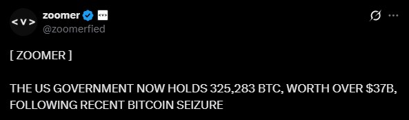 The forfeiture brings total US government Bitcoin holdings to an estimated 325,283 BTC, valued at over $37 billion at October 14 prices.