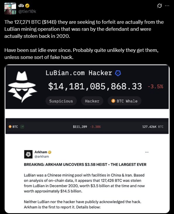 Initial reports on October 14 suggested the 127,271 BTC originated from the LuBian mining operation that Chen Zhi ran and were stolen in 2020.