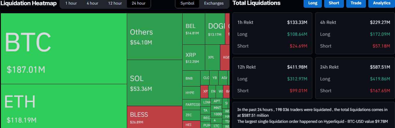 The total value of wrecked positions is on the rise again, nearing $600 million, according to CoinGlassdata. Nearly 200,000 traders have been wrecked on a daily scale. The single-largest liquidated position took place on Hyperliquid and was worth almost $10 million.