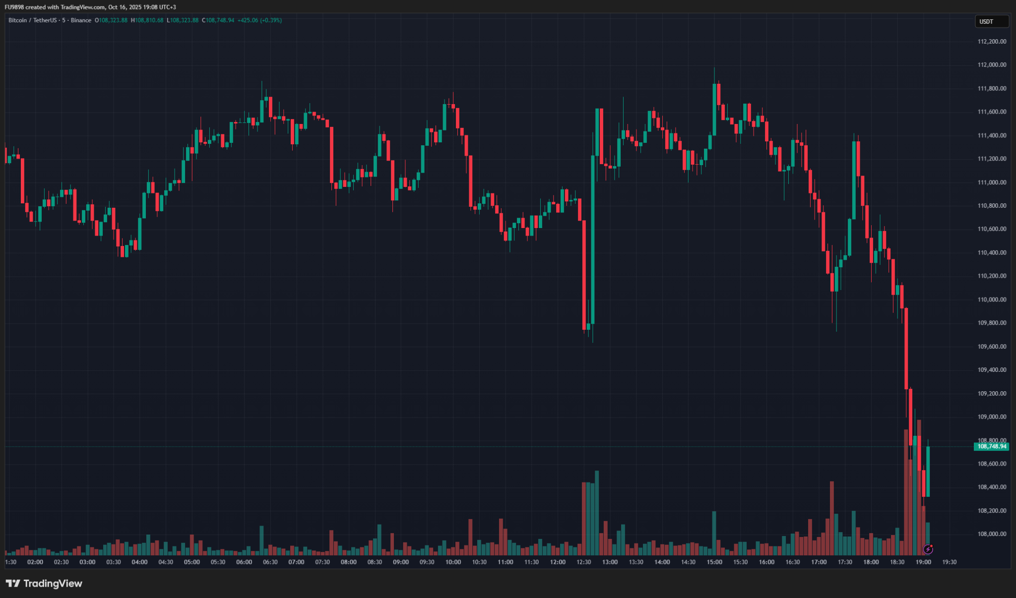 The cryptocurrency market experienced sharp volatility this evening, with the price of Bitcoin (BTC) falling 1.47% in the last hour to $108,762.