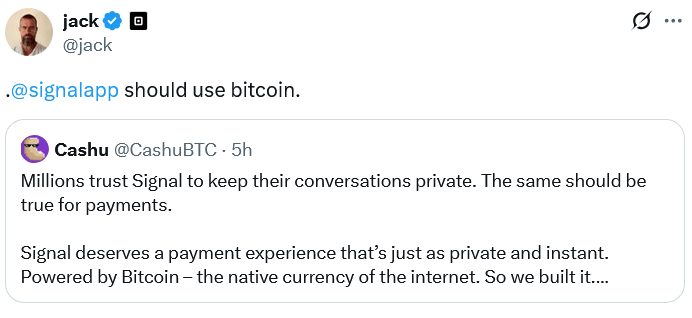 “@Signalapp should use Bitcoin,” Dorsey posted to X on Thursday, retweeting a post from pseudonymous Bitcoin developer Cashu, who is behind the Bitcoin for Signal campaign.