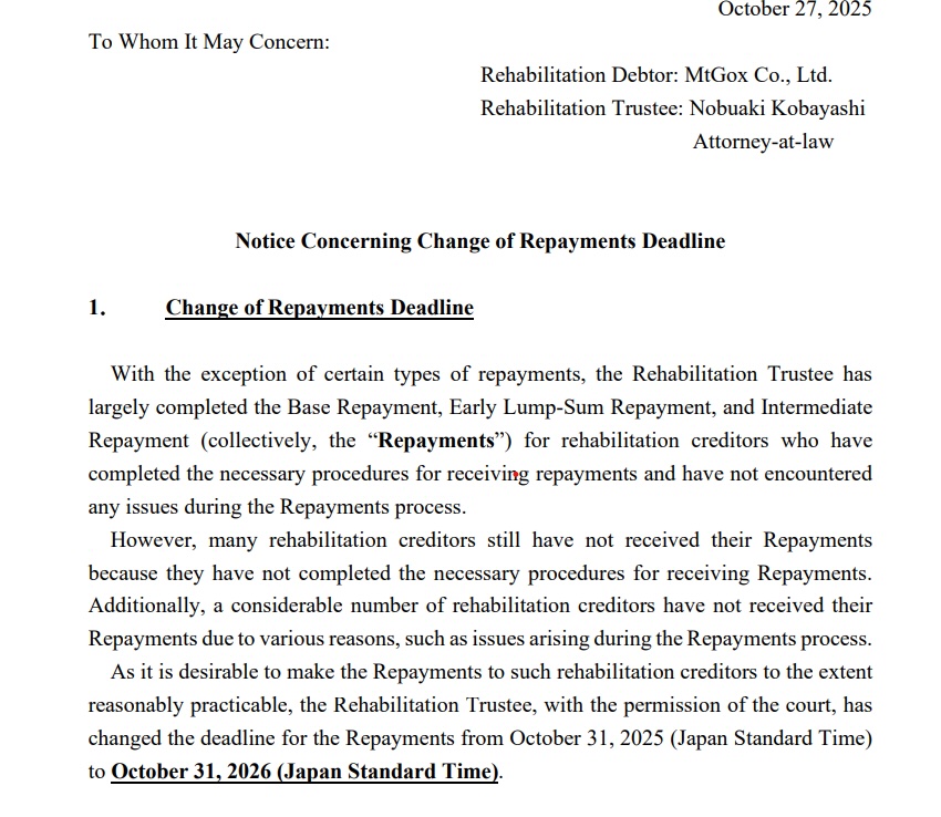 This week’s Bitcoin news, an official notice by the court-appointed trustee, reset the repayment deadline from October 2025 to October 2026.
