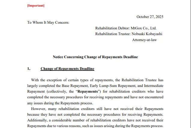 The long-delayed repayments to Mt. Gox creditors have been extended once again. Rehabilitation trustee Nobuaki Kobayashi confirmed in an official notice dated October 27, 2025, that the deadline for creditor repayments has been moved from October 31, 2025, to October 31, 2026. The extension was approved by the Tokyo District Court to allow remaining creditors more time to complete claim procedures through the Mt. Gox Online Rehabilitation System.