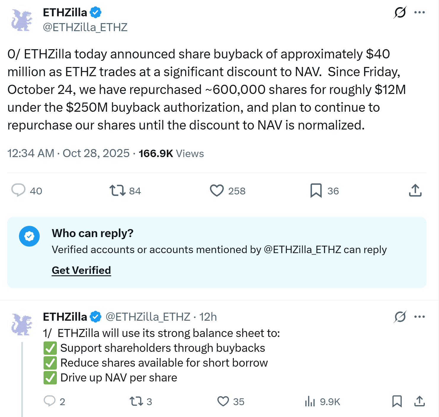 On Monday, ETHZilla also announced a $40 million share buyback as its stock continues to trade at a sharp discount to NAV. The company said it has already repurchased around 600,000 shares worth $12 million since Oct. 24 under its $250 million buyback program.