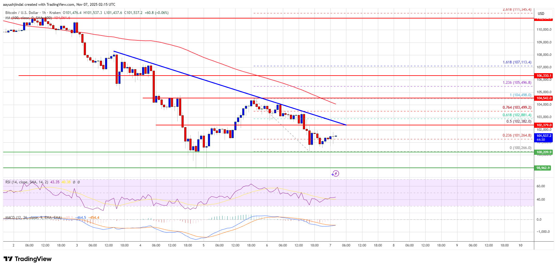 The decline was such that the price even spiked below the $101,200 support. A low was formed at $100,266 and the price is now consolidating losses. There was a move above the 23.6% Fib retracement level of the recent decline from the $104,498 swing high to the $100,266 low.