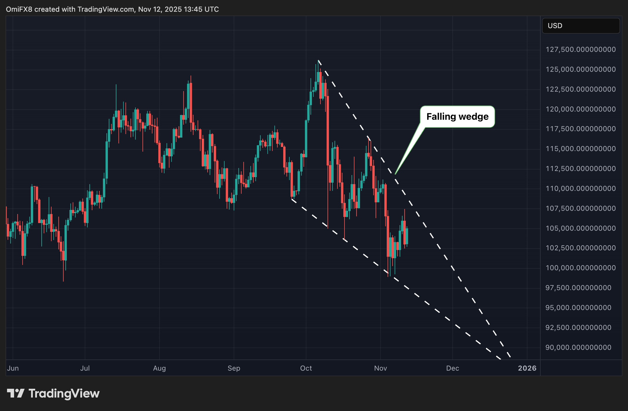That's the message from the price chart, which shows the sharp pull back from the record high of $126,000 on Oct. 8 to recent lows near $106,000, which has left many bulls demoralized, is quietly shaping a classic bullish technical pattern known as a falling wedge.