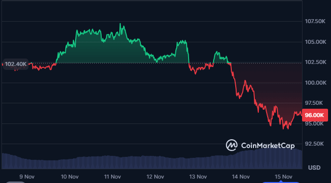 At press time, Bitcoin is trading at around $96,019.37, suggesting a 5.85% decline in the last 7 days.