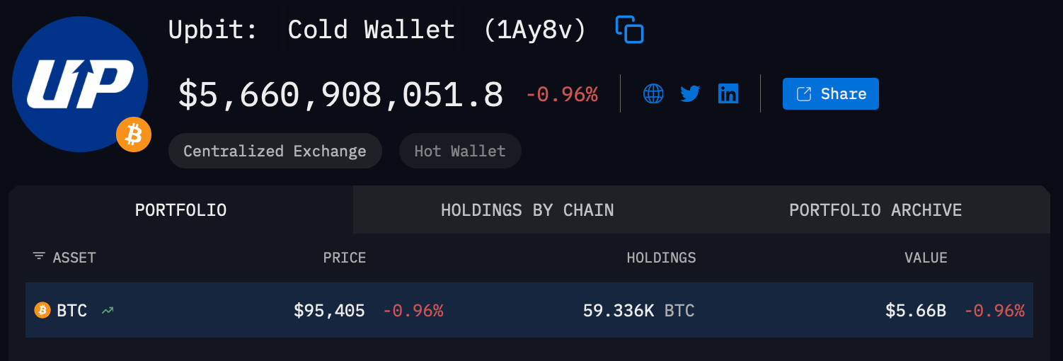 A month before Arkham said as much, Bitcoin.com News highlighted how the now-defunct blockchain explorer OXT showed the same thing — Mr. 100 wasn’t a stealth whale stacking bitcoin, but simply Upbit’s cold wallet collecting inflows. Upbit’s address holds roughly 59,335.54 BTC valued at $5.66 billion today.