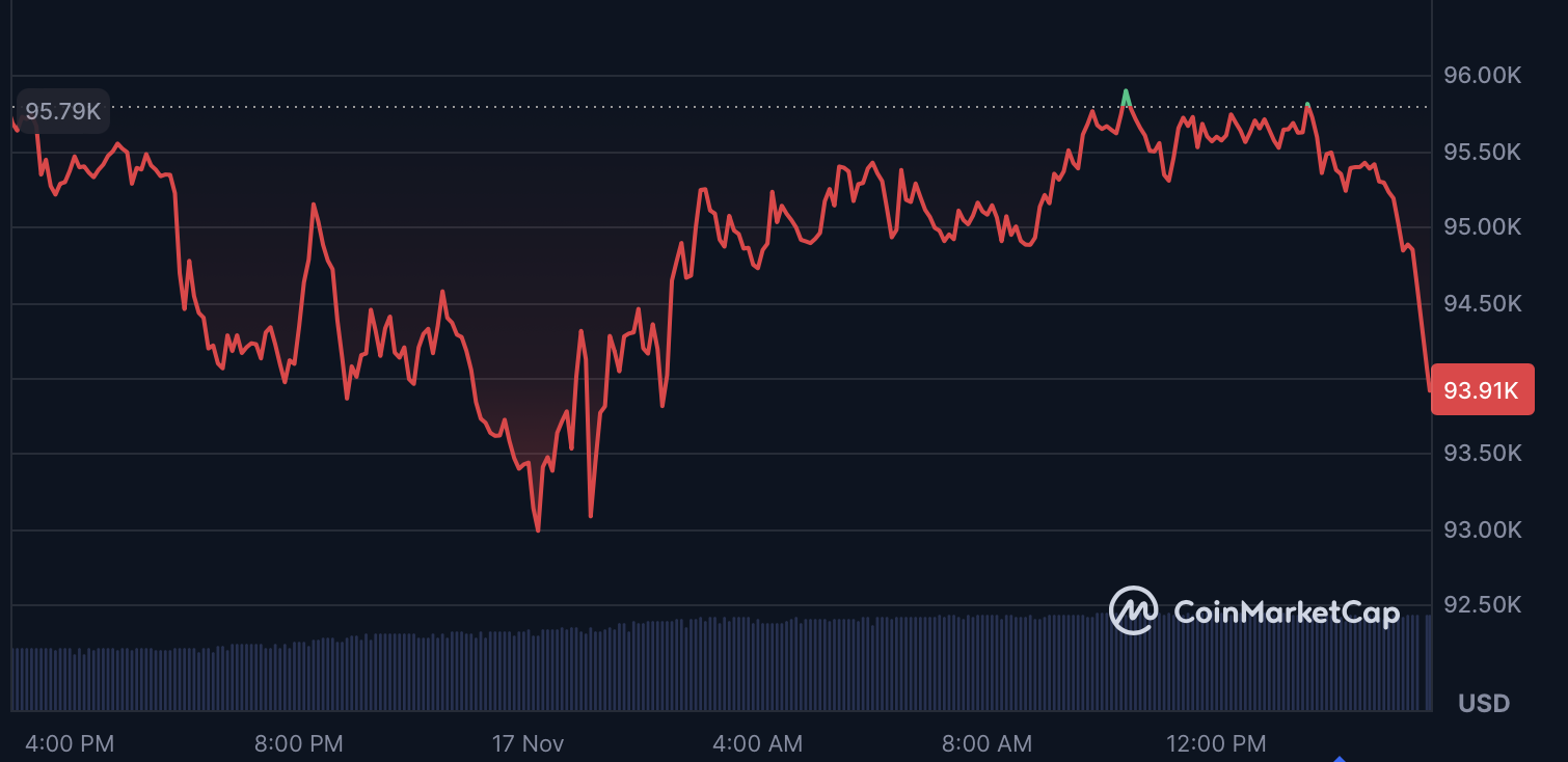 The aggressive accumulation comes at a moment when the crypto market is under renewed pressure. At the time of writing, Bitcoin is trading around $93,910, down more than 1.5% over the last 24 hours, and 11.5% on the week.