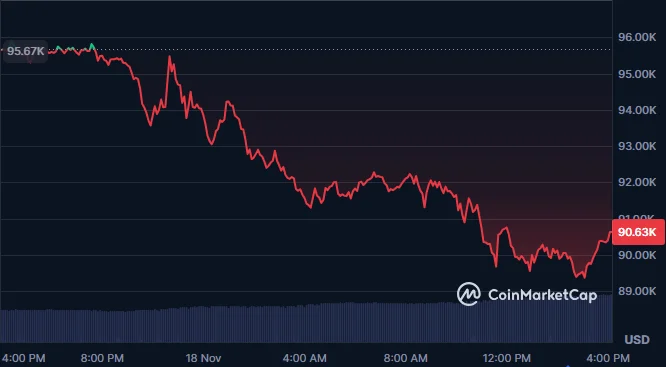At the time of writing, Bitcoin is trading at $90,635, suggesting a 5.21% decline in the last 24 hours.
