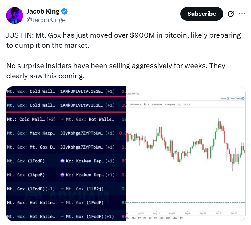 “Mt. Gox has just moved over $900M in bitcoin, likely preparing to dump it on the market,” wrote Jacob King, financial analyst and CEO at SwanDesk, in a Tuesday X post.
