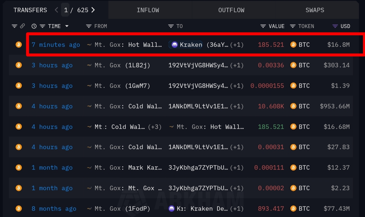 - Mt. Gox transferred 185.2 BTC worth $16.8 million to crypto exchange Kraken.